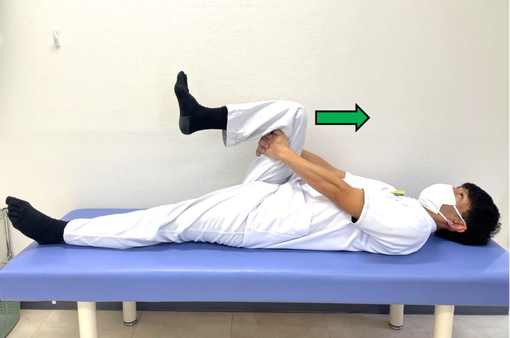 1. 仰向けになり、片方の太ももの裏を両手でかかえます