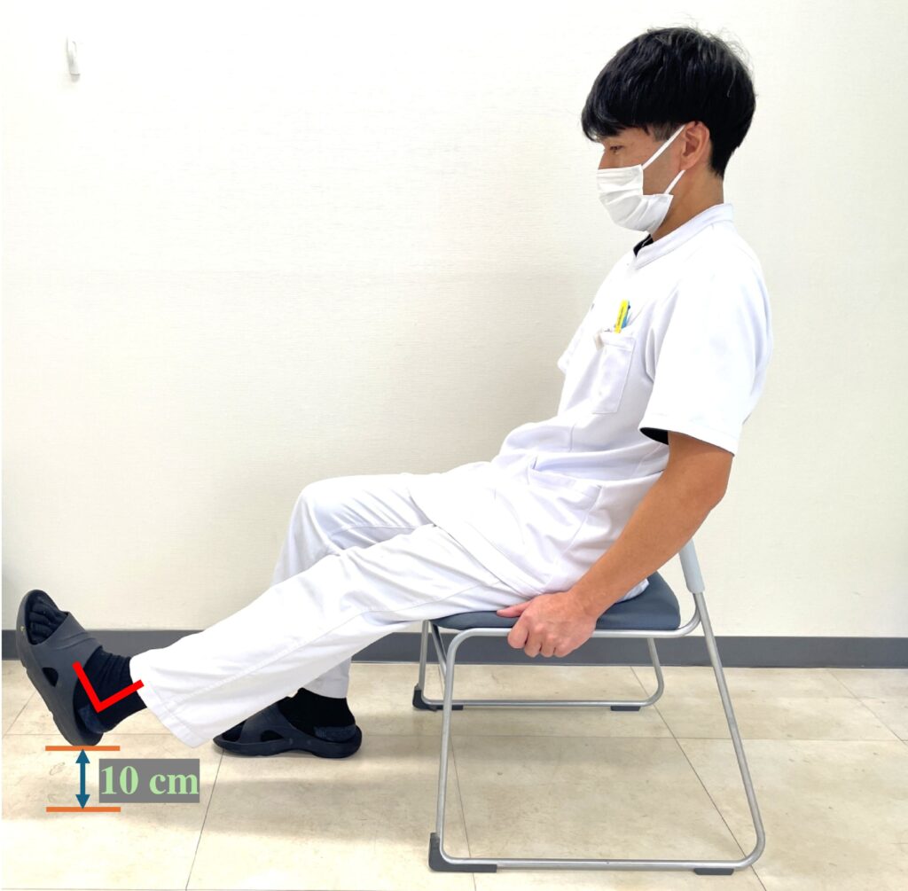 1. 椅子に腰かけ、片方の膝は曲げ、もう片方の膝は伸ばしておきます