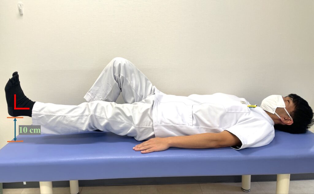 3. 膝を伸ばしている方の足をゆっくり上げて、床から10cmのところで5-10秒間止めます。その後ゆっくりおろします