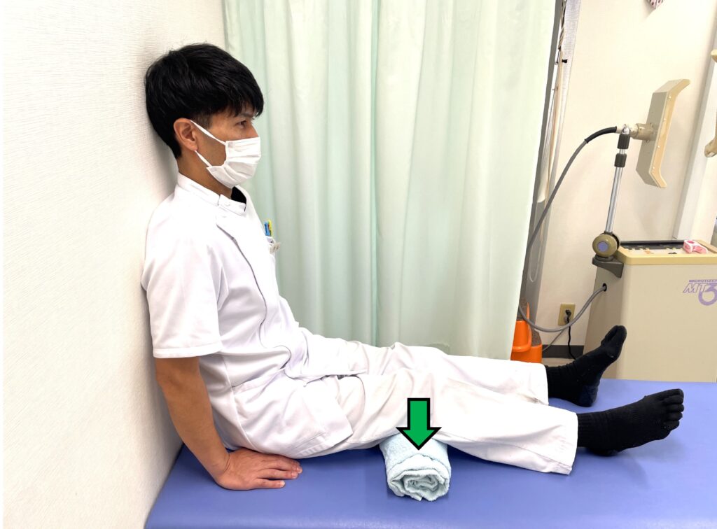 1. 壁に寄りかかり、こぶし1個分くらいの高さに丸めたタオルを両膝の下に入れます