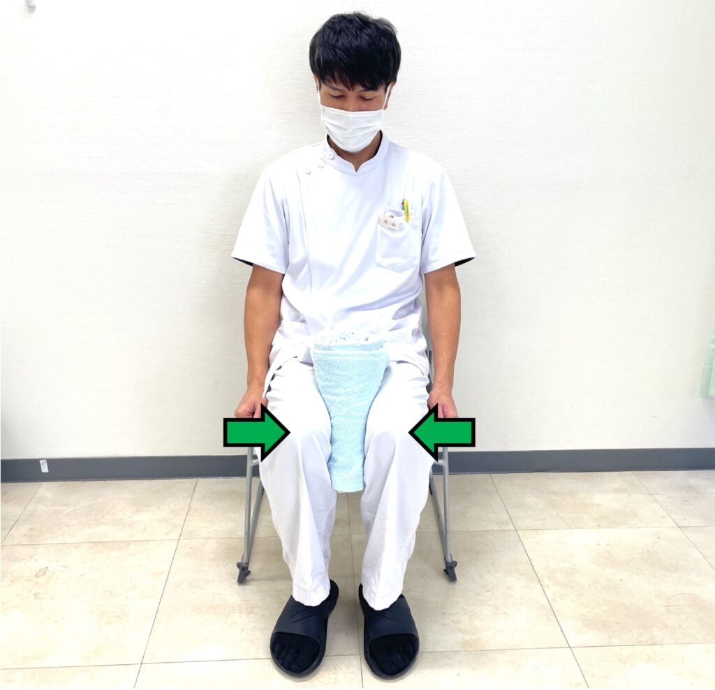 1. 椅子に腰かけ、こぶし2個くらいの幅に丸めたタオルを、左右の膝の間に挟みます